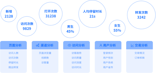多维度数据分析精细化运营,支持页面,访问,用户,多渠道数据分析管理
