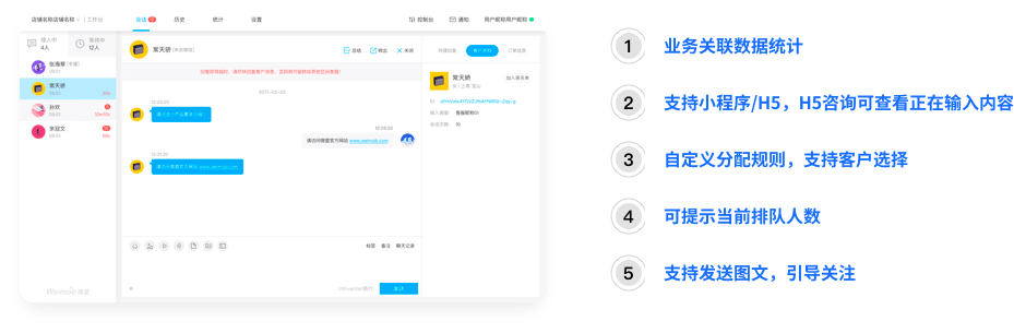 微站专业客服功能,公众号,H5,小程序三类渠道讯息分类收集;客服坐席自定义分配,用户实时交流,防止意向流失