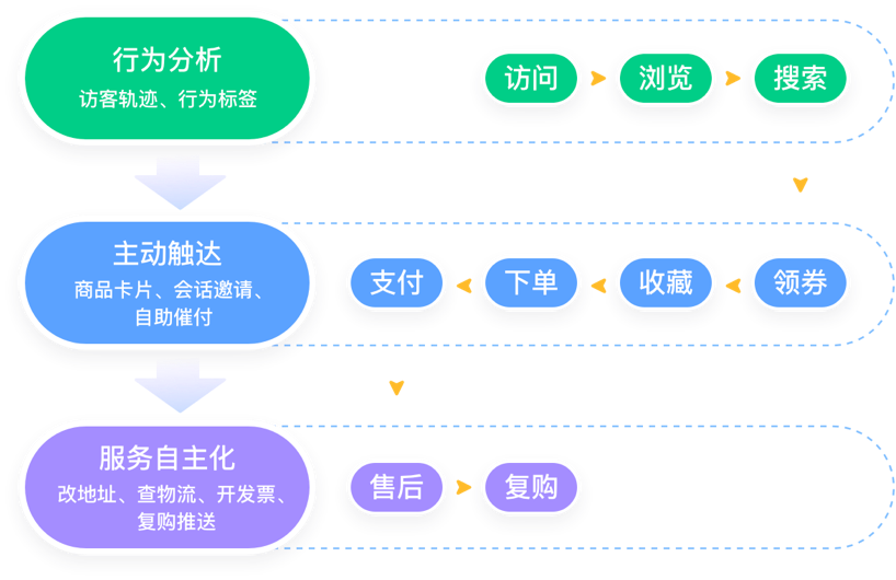面向消费者全生命周期,结合企业用户画像,设计场景化服务。包括购物前通过消费者的行为洞察, 优化淘货体验;购物中通过服务的精准触达,提升询单转化率;购物后通过售后的自助服务,提升服务效率