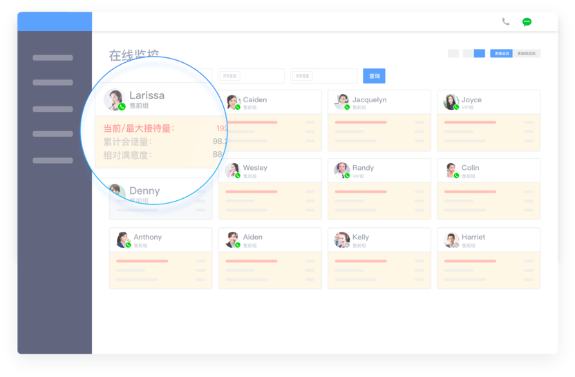 基于坐席地图实时监控,提供多维度的监控指标:敏感词报警、响应超时、会话超时、满意度报警等。 对服务过程中的突发问题实时预警,管理员实时进行坐席间的指挥调度。同时结合电商行业服务指标体系, 独家定制数据监控大屏,对海量的业务数据进行高效率分析,全面赋能企业监管效率,提高用户满意度。